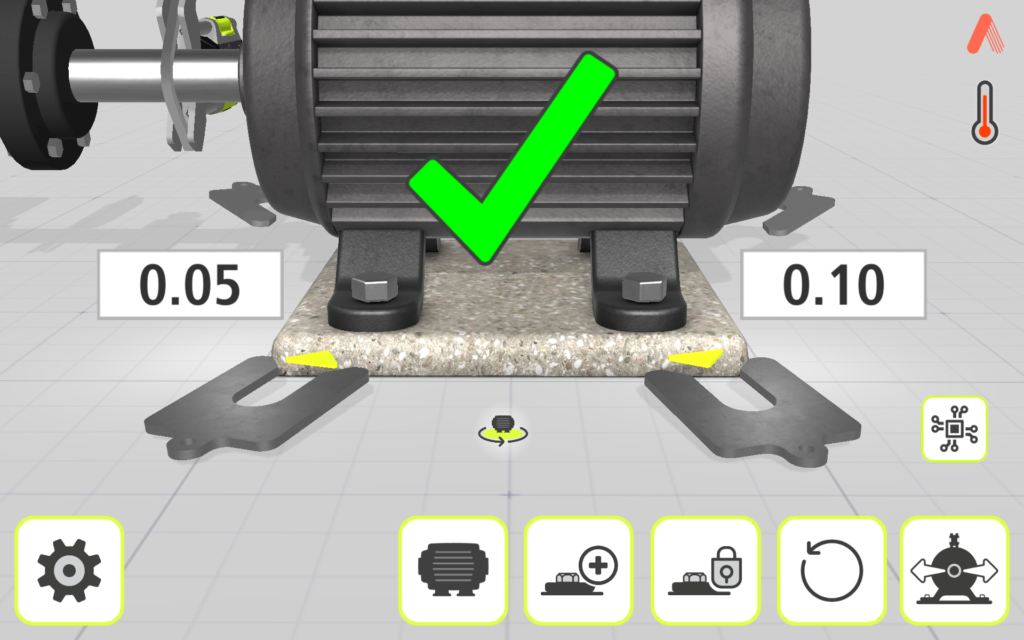 Proces osiowania wałów prezentowany jest w formie animacji 3D. Kolorystyka wskazuje stopień dokładności ustawienia, co ułatwia szybkie podjęcie decyzji korekcyjnych.